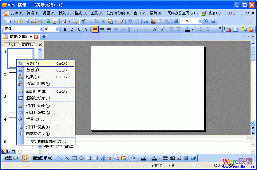 第4步:在幻灯片预览窗格中右击第1张幻灯片,选择“复制”,再多次右击,选择“粘贴”即可将空白幻灯片复制多张(比如5张)出来。